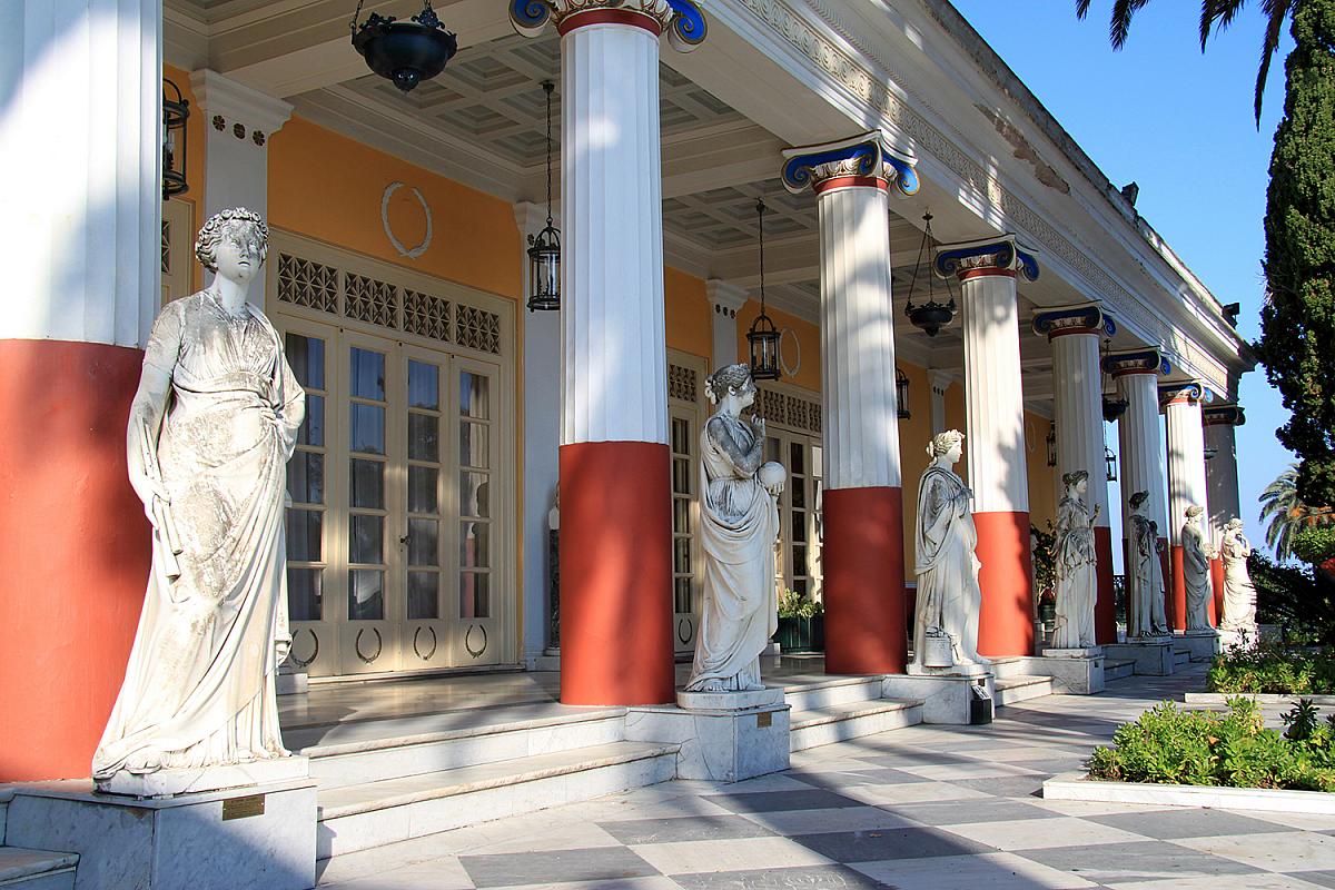 Zámek Achillion je patrně nejkrásnější neoklasickou památkou Řecka. Sněhobílý komplex, obklopený úchvatnými zahradami se spoustou soch, romantických zákoutí, fontán a labyrintů, byl postaven koncem 19. století a dodnes představuje návštěvníkům původní interiéry, jež sloužily slavné císařovně.